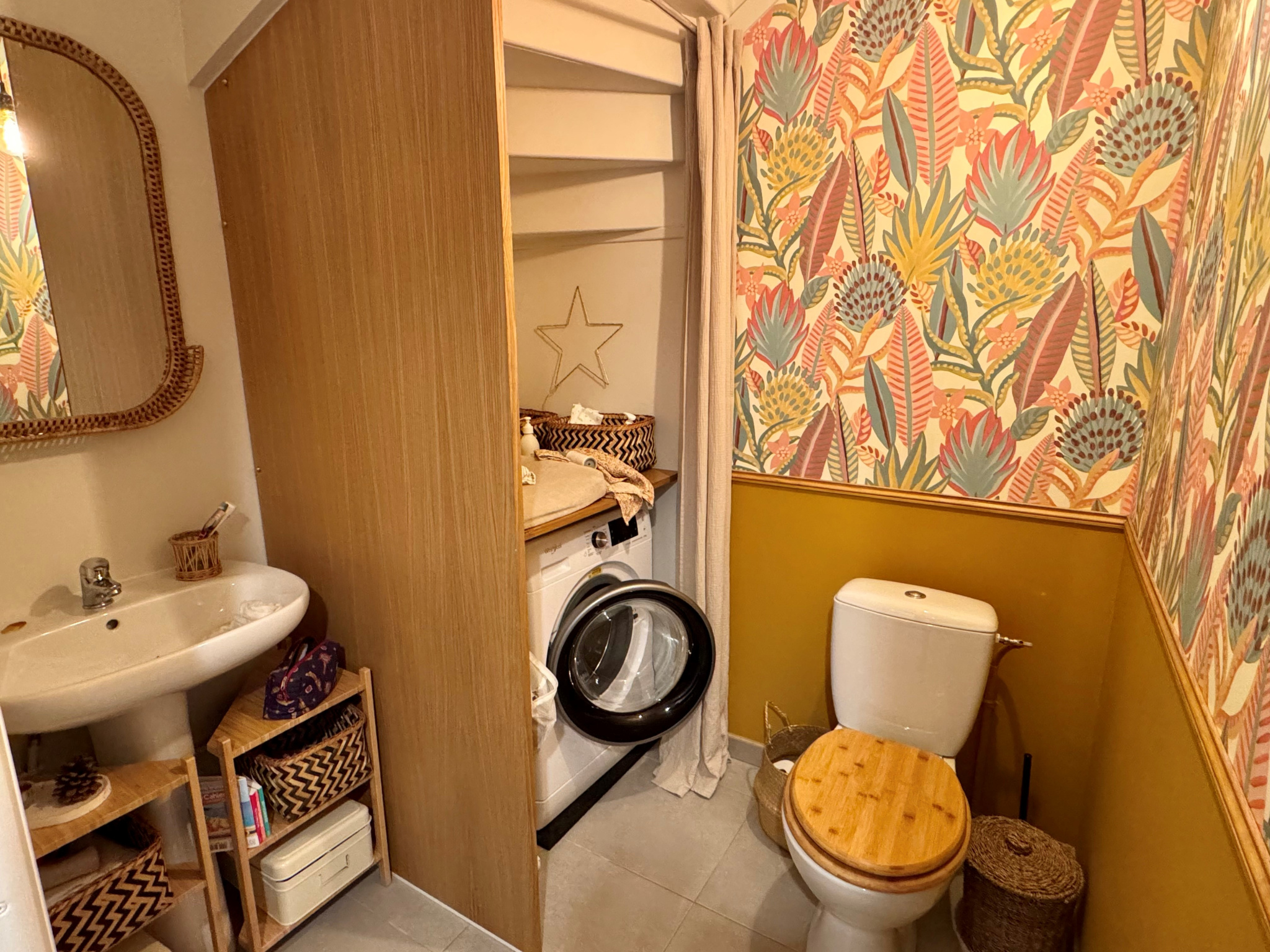Elle se compose d’une entrée accueillante avec vestiaire, d’un WC avec espace buanderie, d’un séjour-salon baigné de lumière, ouvert sur une cuisine moderne, aménagée et entièrement équipée, parfaite pour recevoir en toute convivialité.